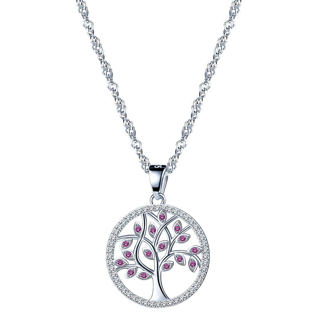Odkryj nasz wyjątkowy naszyjnik Drzewo Życia z eleganckim, srebrnym wykończeniem, ozdobiony różowymi kryształami i cyrkoniami, które nadają mu subtelnego blasku. Ten piękny wisiorek jest nie tylko modnym dodatkiem, ale także symbolem harmonii, siły i wiecznego życia. Idealny na prezent lub jako stylowy akcent do Twojej garderoby.