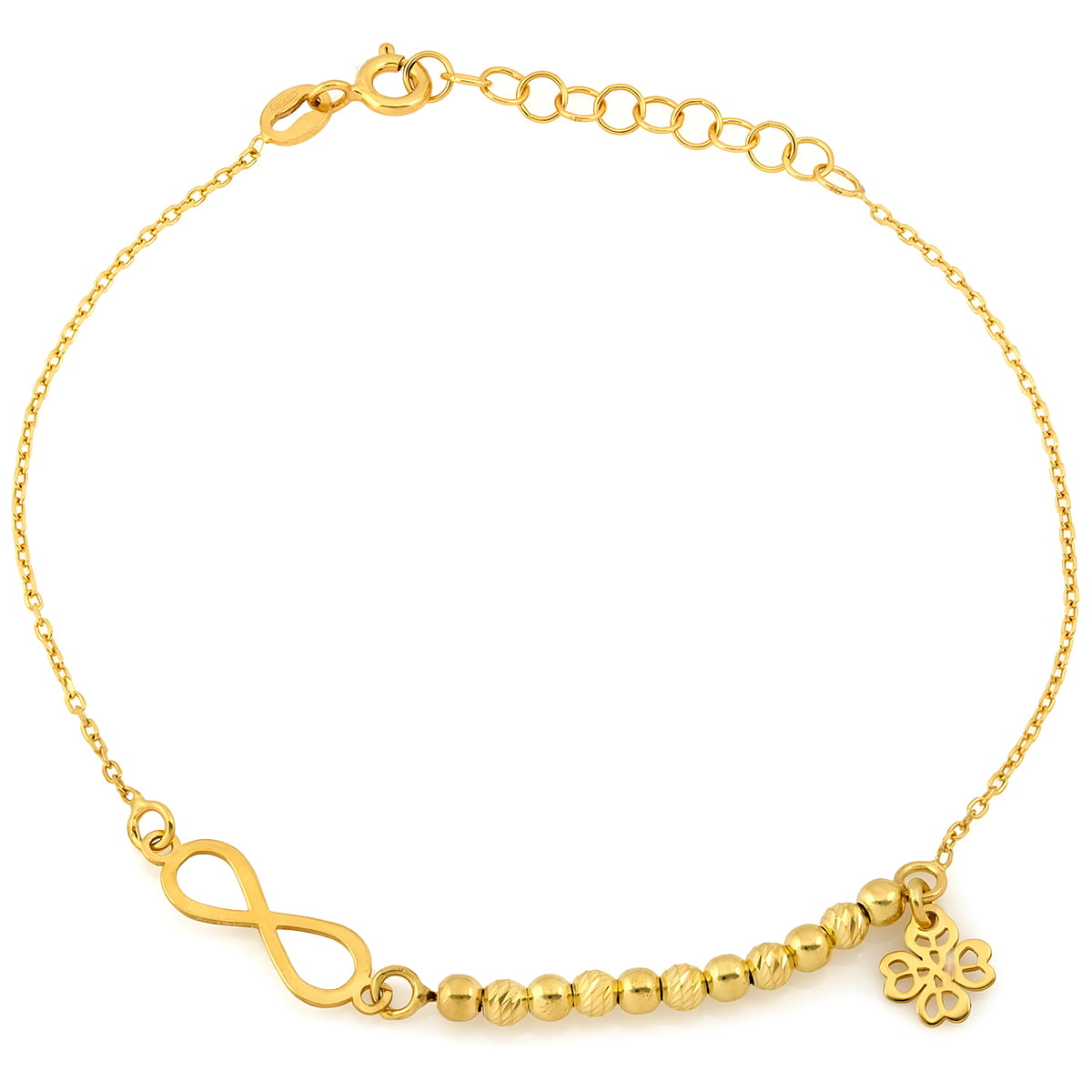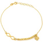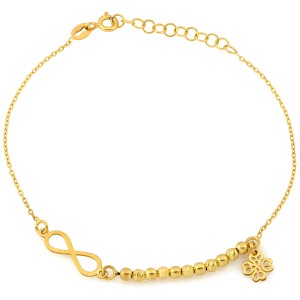 Wyjątkowa bransoletka srebrna pozłacana z motywem nieskończoności, koniczynką i ozdobnymi kuleczkami to biżuteria pełna pozytywnej energii, symboliki i elegancji.