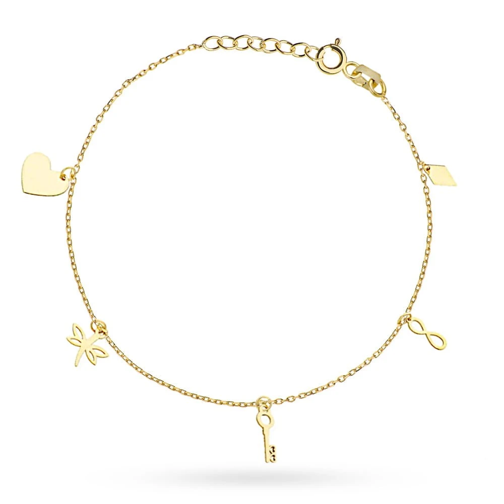 Bransoletka na nogę z elementami serce, ważka, kluczyk, nieskończoność i romb