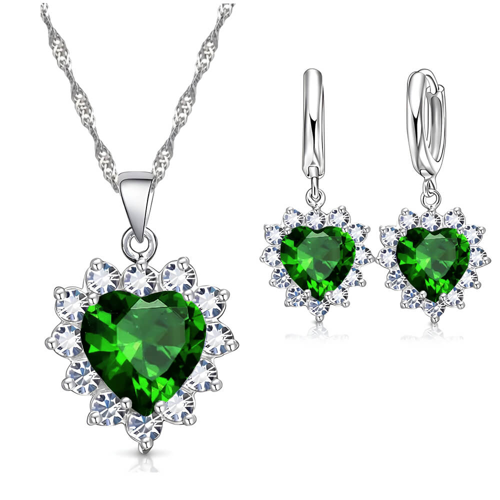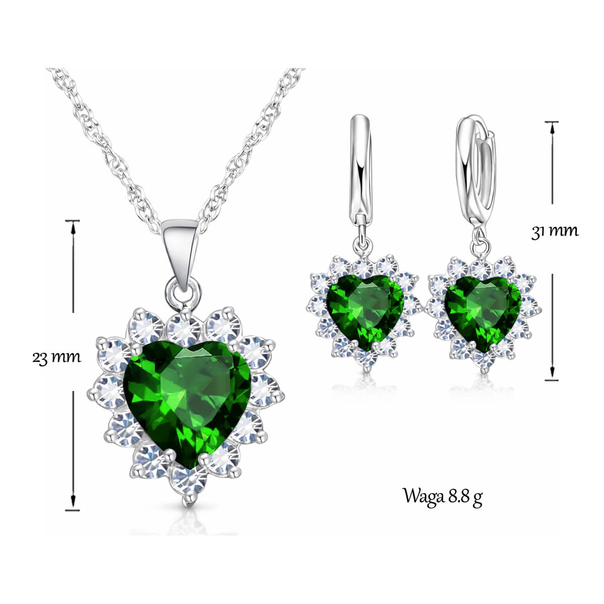 Komplet Biżuterii Srebro 925 Szmaragdowe Serce – Cyrkonie, Kolczyki Angielskie