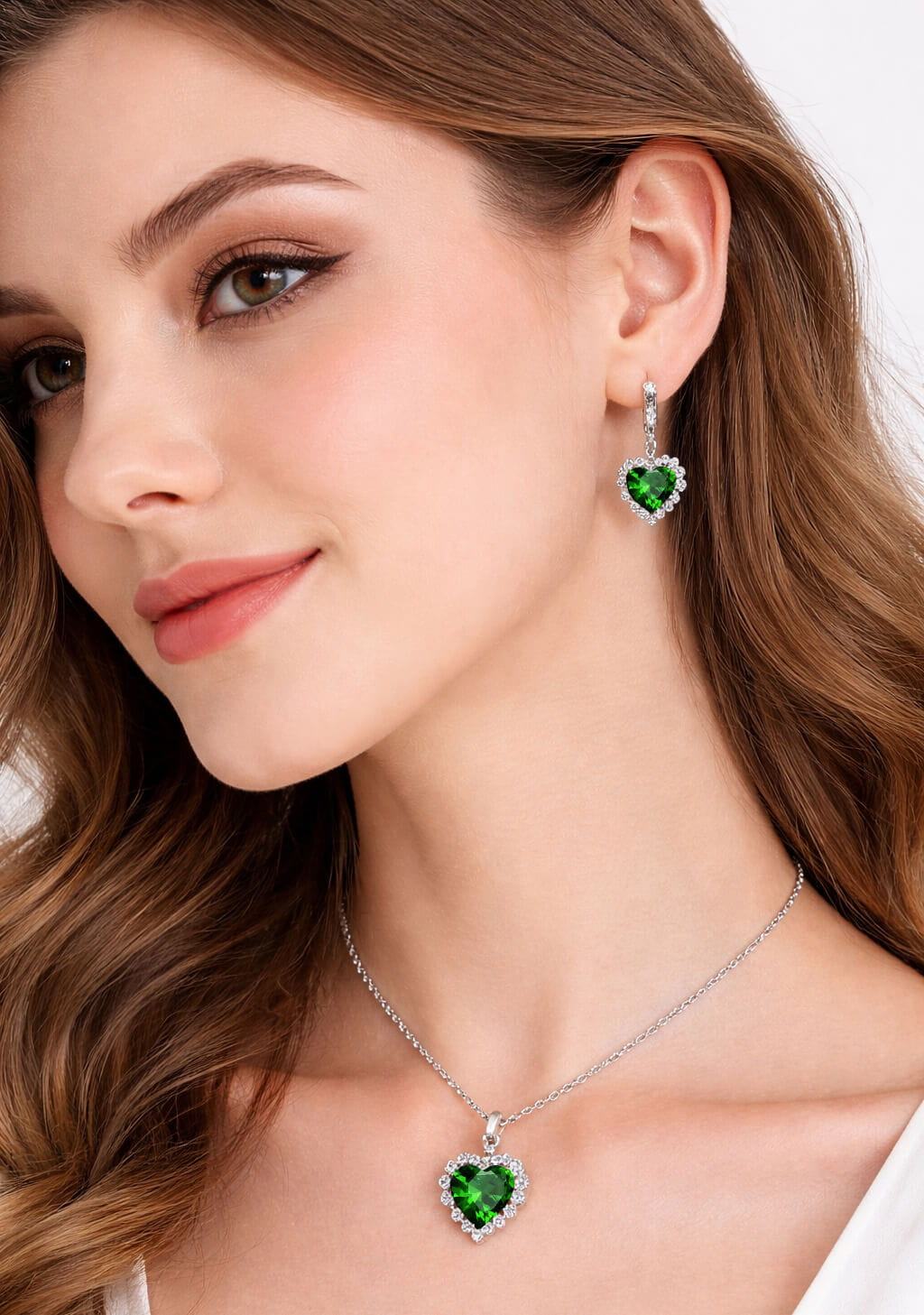 Centralnym elementem kompletu jest szmaragdowa cyrkonia w kształcie serca, której intensywna barwa przyciąga uwagę i nadaje biżuterii charakteru. Kamień główny został otoczony jasnymi cyrkoniami, co podkreśla jego kolor oraz wzmacnia efekt odbicia światła. Takie zestawienie sprawia, że komplet prezentuje się wyraziście, zachowując jednocześnie uniwersalny charakter.