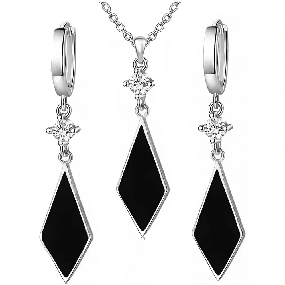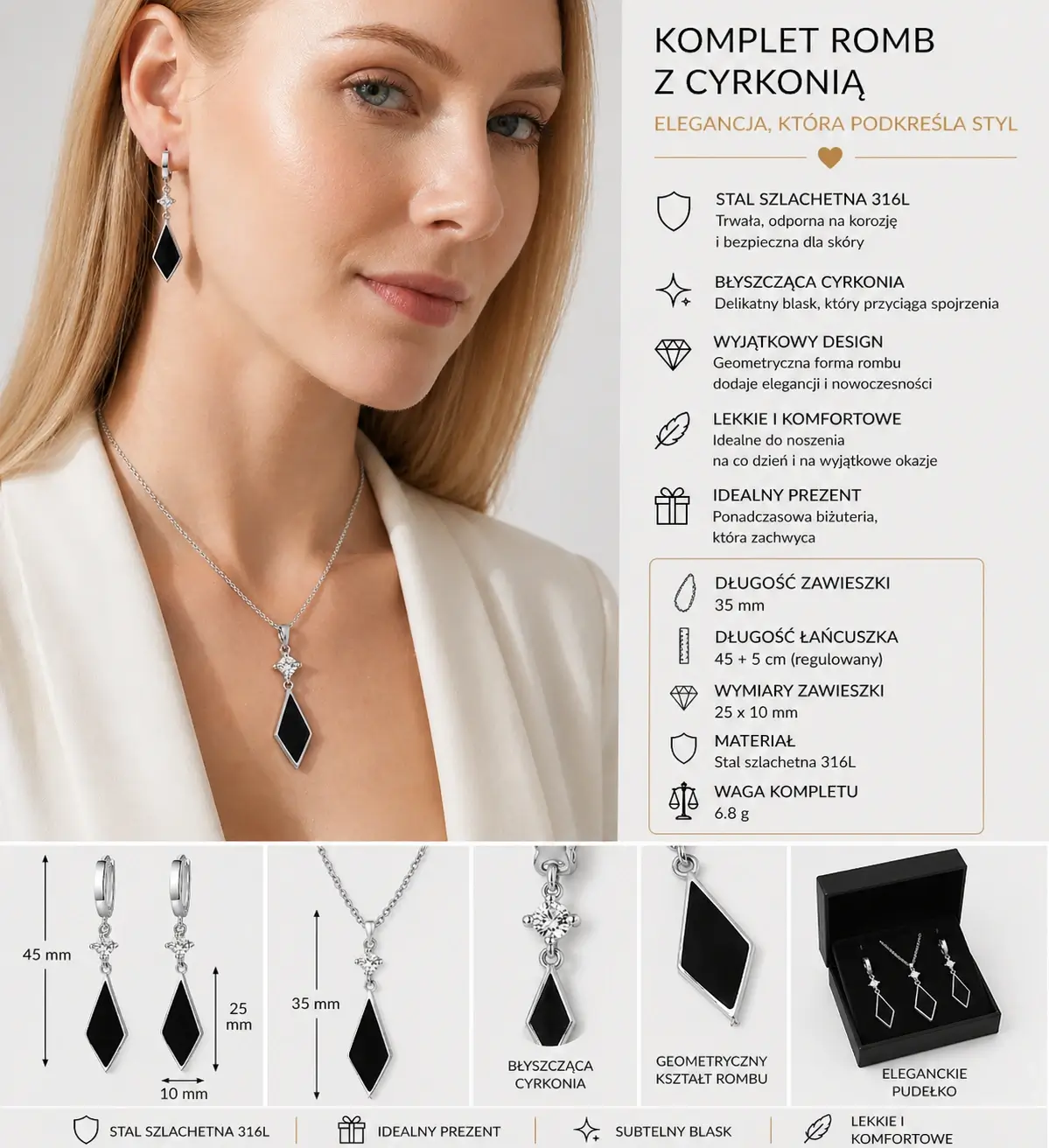 Komplet Damski Stal 316L Onyks Czarny Romby z Cyrkoniami Elegancki Zestaw
