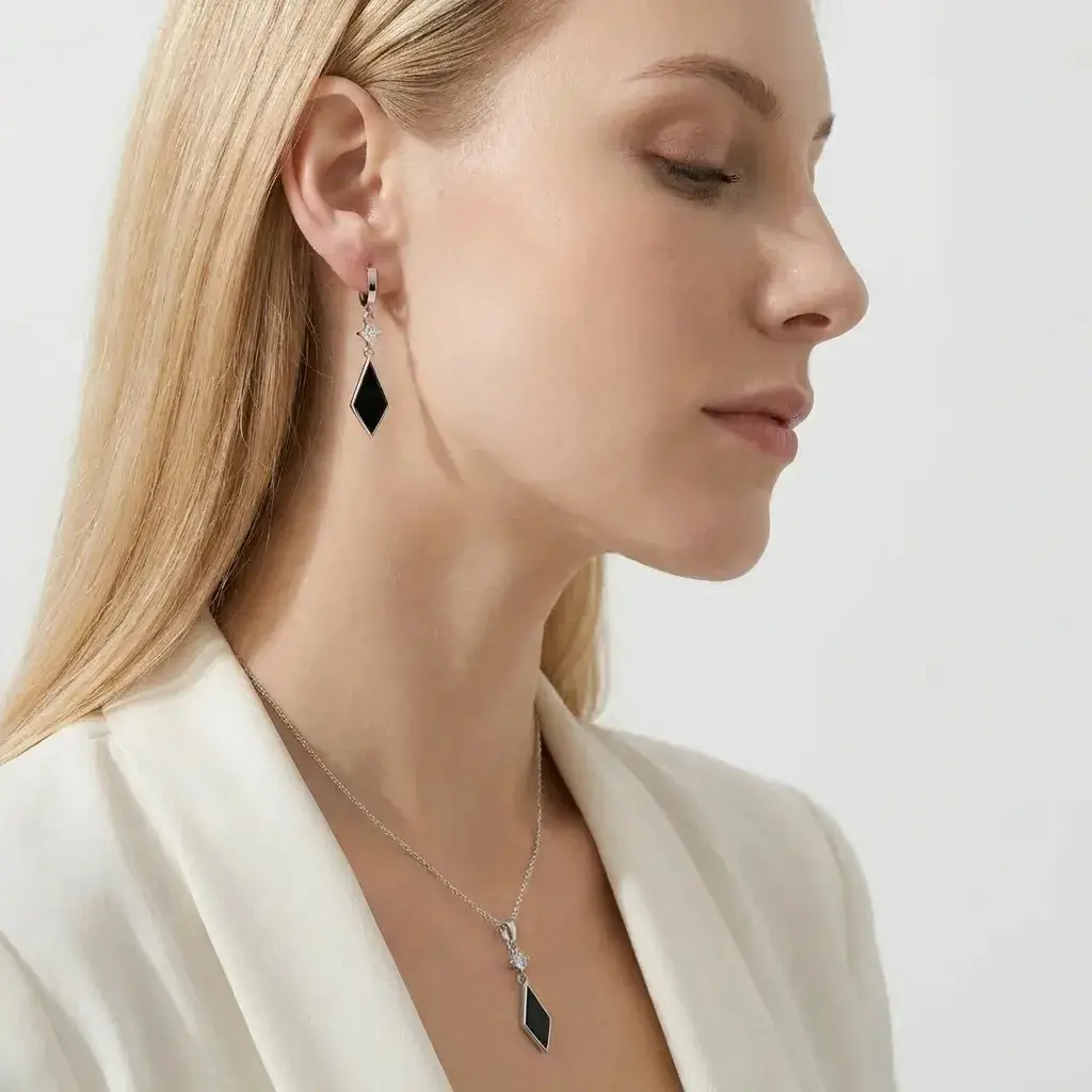Centralnym elementem jest geometryczny romb wypełniony czarnym onyksiem syntetycznym, który tworzy wyrazisty kontrast i nadaje biżuterii charakteru.
