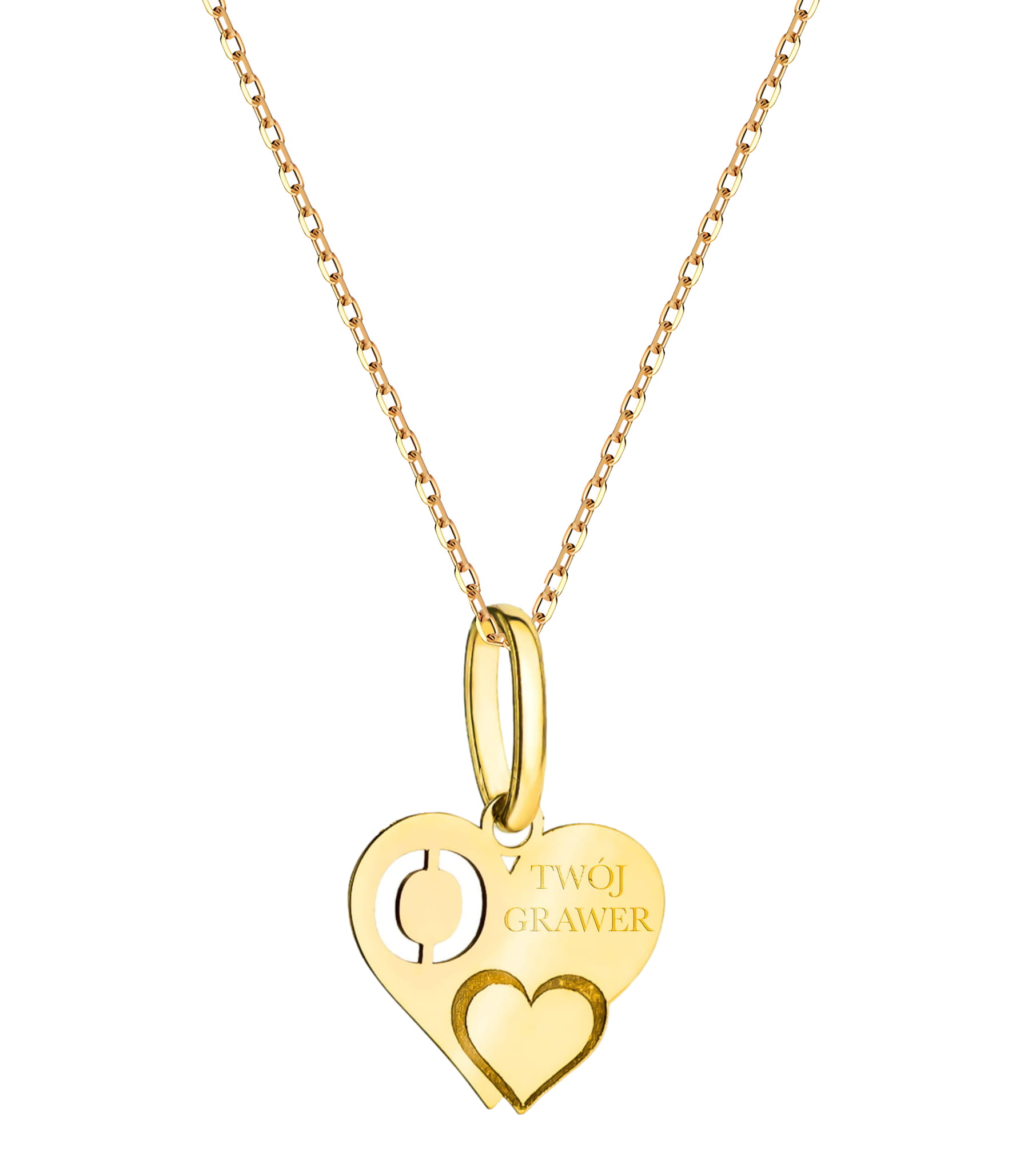 Złota zawieszka w formie serca z inicjałem "O" oraz opcją personalizacji poprzez grawerunek, na delikatnym łańcuszku typu ankier o długości 42+3 cm