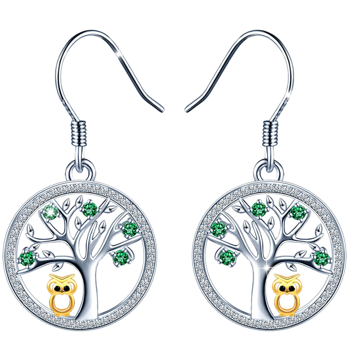 Srebrne Długie Kolczyki z Cyrkoniami Sowa Drzewo Życia - Emerald - Prezent na Rocznice Urodziny - Srebro 925