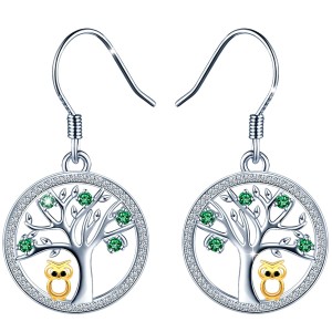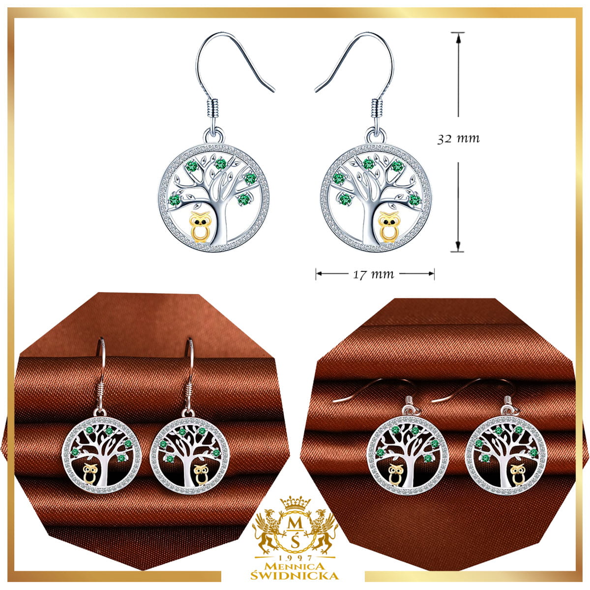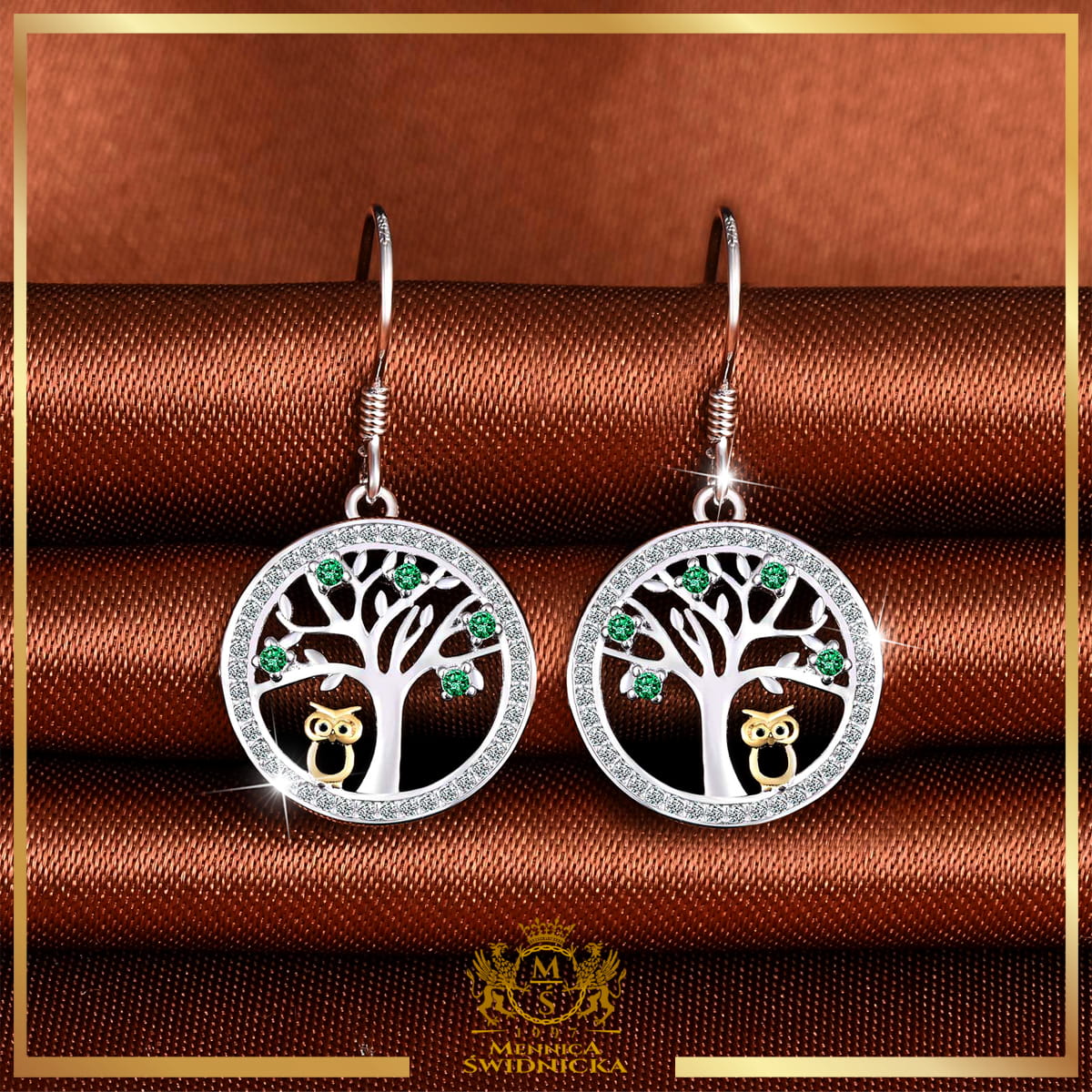 Kolczyki Drzewo Życia z Sówką i Zielonymi Cyrkoniami