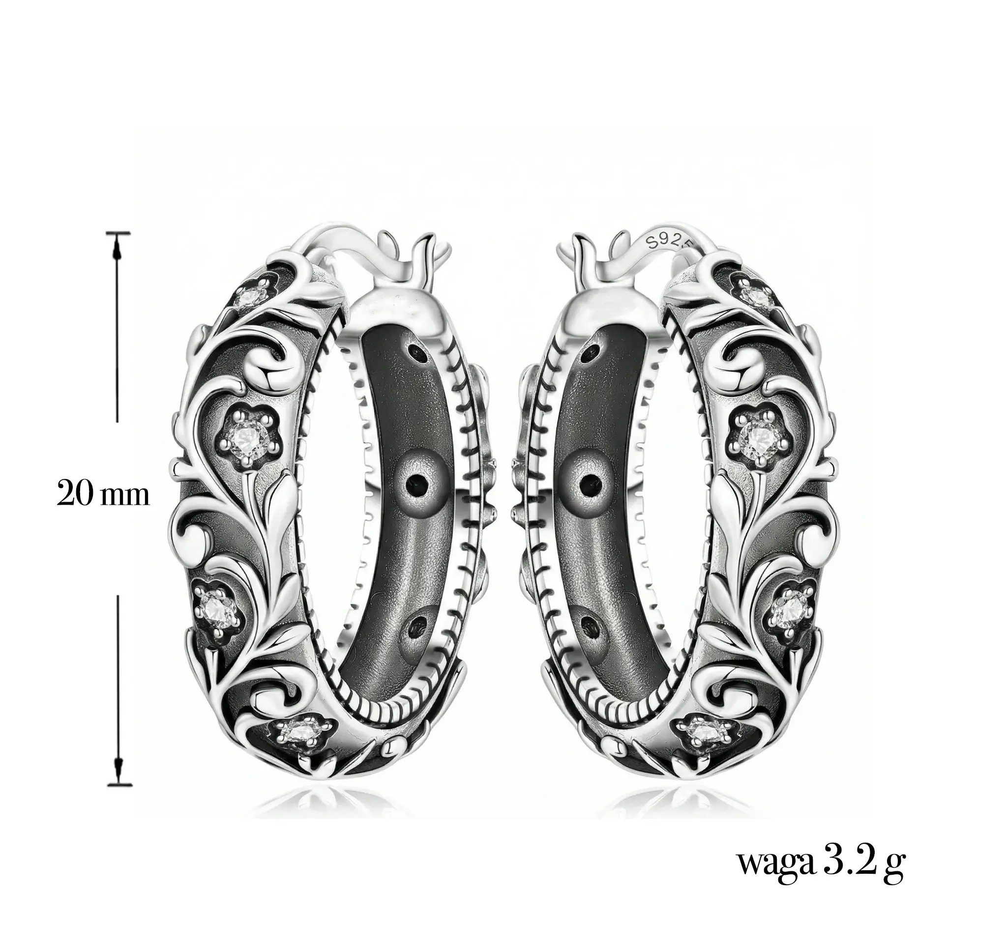 Delikatnie osadzone cyrkonie dodają subtelnego blasku, który pięknie kontrastuje z ciemniejszym wykończeniem srebra. Dzięki temu kolczyki przyciągają uwagę i wyróżniają się na tle klasycznych modeli.
