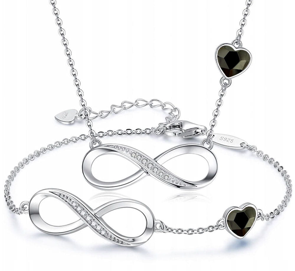 Srebrny Komplet Infinity Serce z Cyrkoniami Bransoletka Celebrytka Naszyjnik - Graphit - Srebro 925 Prezent na Dzień Kobiet