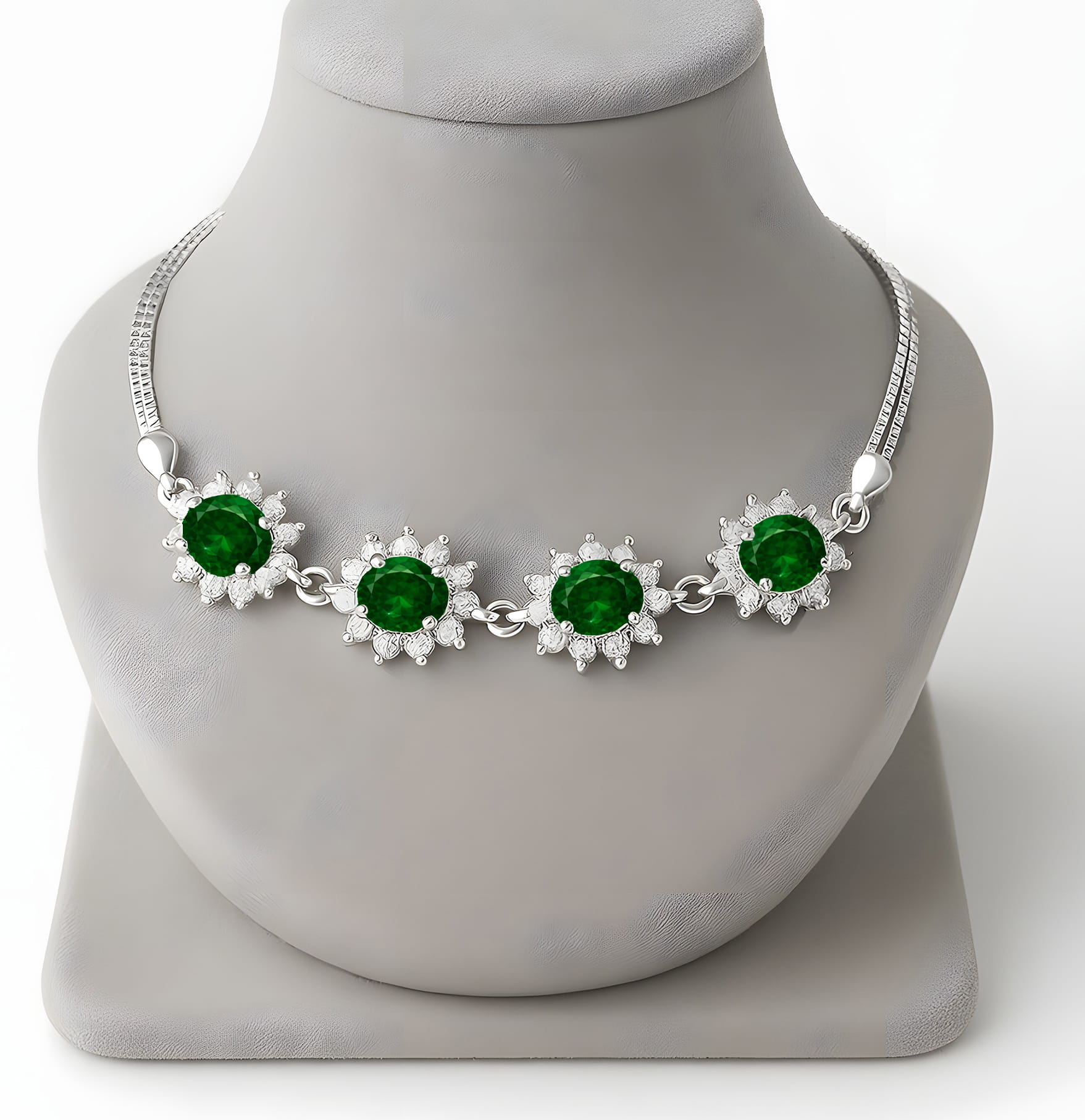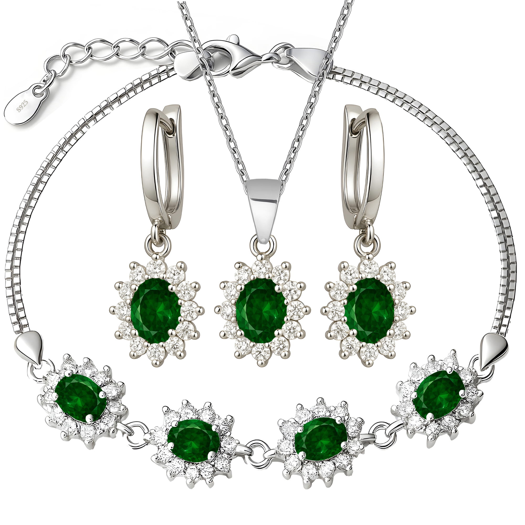 Srebrny komplet biżuterii z szmaragdowymi kryształami – kolczyki, naszyjnik i bransoletka