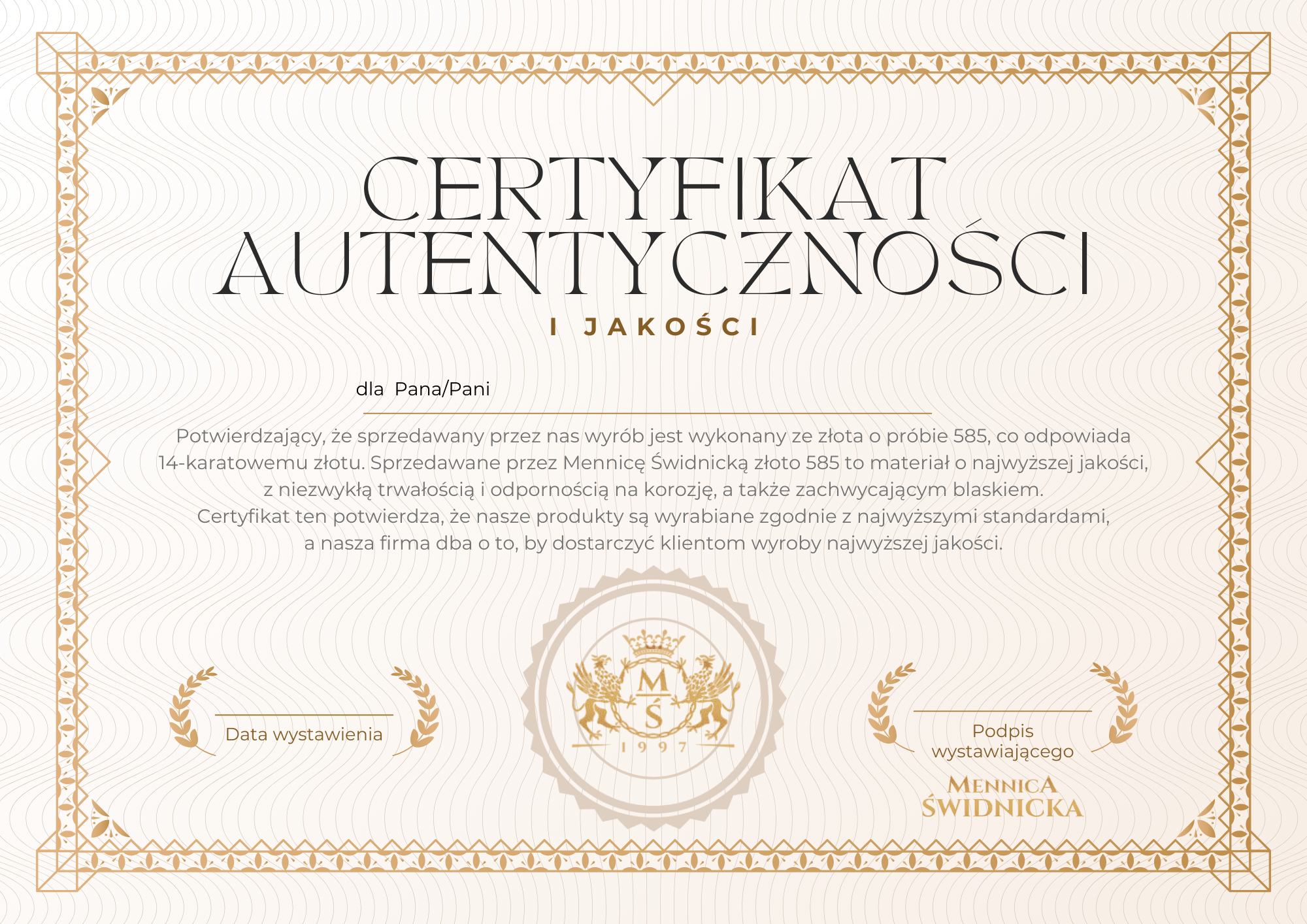 Do każdej biżuterii ze złota zakupionej w Mennicy Świdnickiej otrzymujesz imienny certyfikat autentyczności. To oficjalne potwierdzenie, że wybrany przez Ciebie produkt jest w rzeczywistości wykonany ze złota próby 585.