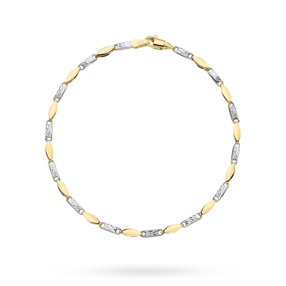 Elementy bransoletki zostały ozdobione precyzyjnym diamentowaniem, dzięki czemu powierzchnia odbija światło i tworzy intensywny efekt połysku. Naprzemiennie ułożone ogniwa w dwóch kolorach złota tworzą harmonijną kompozycję, która podkreśla szlachetność wykonania.