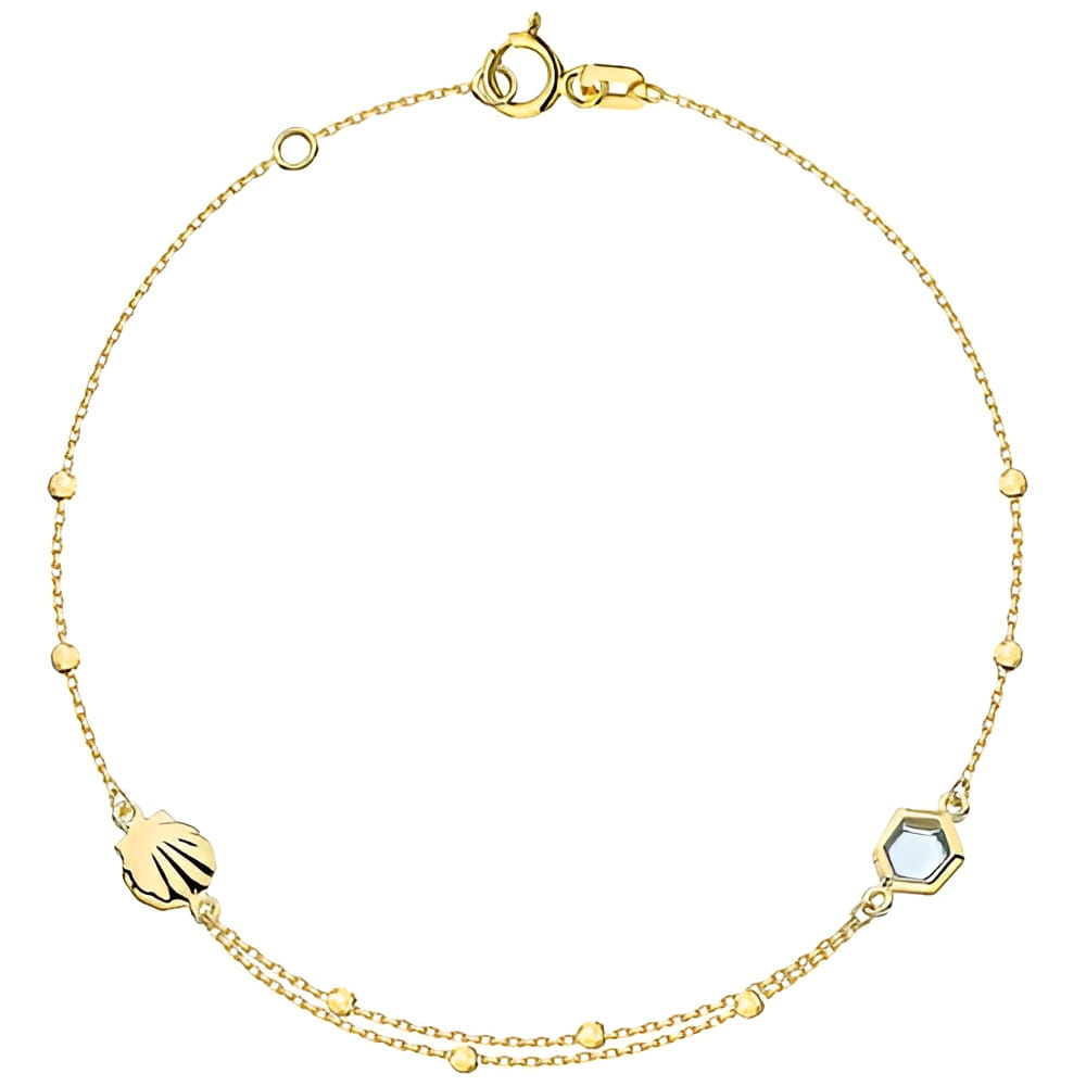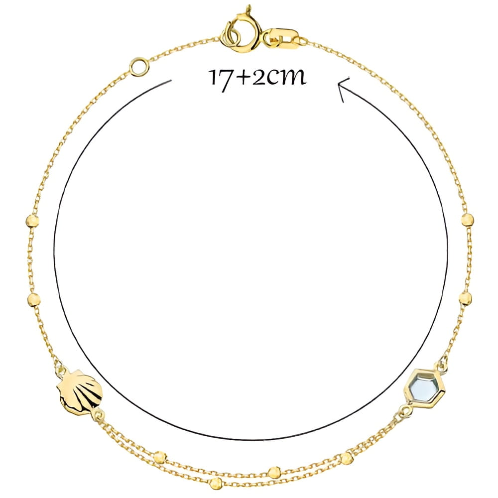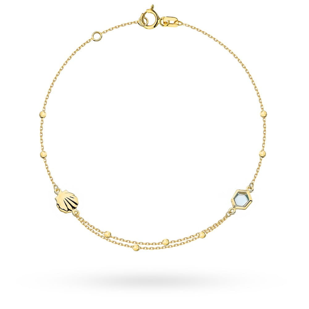 Pełna wdzięku złota bransoletka pr. 585 ozdobiona jest błękitnym kamieniem, motywem muszli oraz drobnymi złotymi kuleczkami. Delikatny podwójny łańcuszek nadaje jej lekkości, a błyszczące detale pięknie odbijają światło. Błękitny kamień w oprawie o sześciokątnym kształcie przyciąga wzrok i nadaje całości wakacyjnego charakteru. Motyw muszli podkreśla morski klimat, idealny na lato i nie tylko. To doskonała propozycja na prezent lub dodatek do stylizacji w stylu boho i glamour.