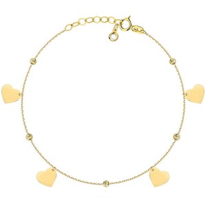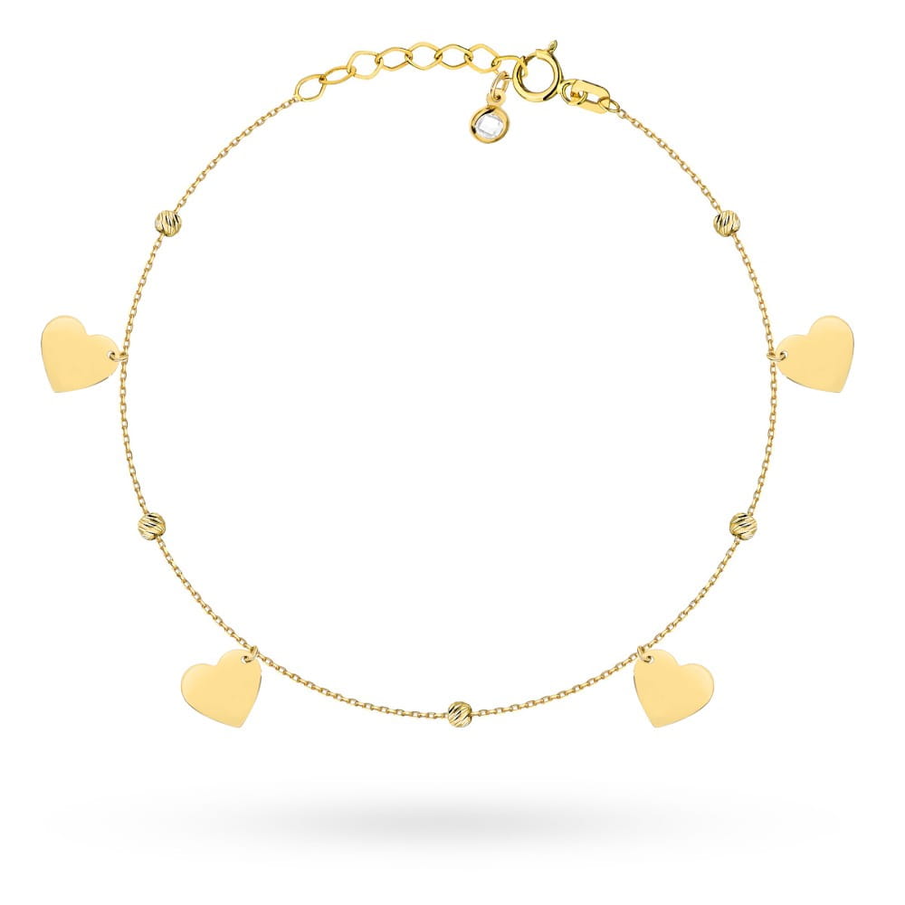 Romantyczna bransoletka na nogę wykonana z żółtego złota próby 585, zdobiona diamentowanymi kulkami oraz zawieszkami w kształcie serduszek. Każdy detal został starannie dopracowany, by tworzyć kompozycję pełną wdzięku i blasku. Regulowane zapięcie umożliwia idealne dopasowanie do kostki. Ta złota bransoletka to wyraz kobiecości i uczucia – świetna jako prezent dla ukochanej osoby.