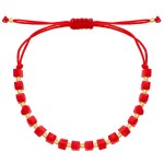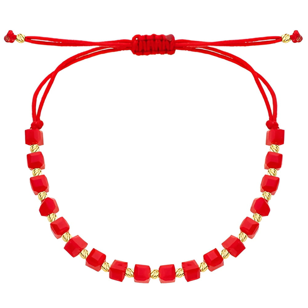 Czerwona bransoletka na sznurku z geometrycznymi kostkami i złotymi kuleczkami to oryginalna propozycja dla osób lubiących wyraziste dodatki. Regulowane wiązanie pozwala dopasować bransoletkę do każdego nadgarstka. Kontrast między intensywną czerwienią a złotymi akcentami przyciąga wzrok i dodaje energii stylizacji. Lekka, wygodna i efektowna – świetna zarówno solo, jak i w zestawie z innymi modelami. Idealna również na prezent z pozytywnym przesłaniem.