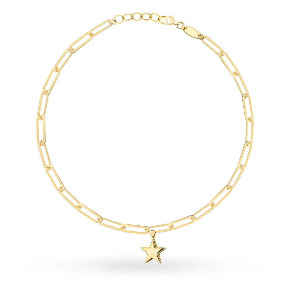 Bransoletka wykonana z złota próby 585 przyciąga uwagę dzięki wydłużonym ogniwom oraz zawieszce w kształcie pełnej gwiazdki. Solidne ogniwa zapewniają trwałość, a regulowane zapięcie pozwala na idealne dopasowanie. Całość prezentuje się elegancko i stylowo, nadając się zarówno na co dzień, jak i na specjalne okazje. To biżuteria, która łączy prostotę formy z wyjątkowym detalem.