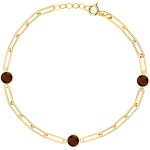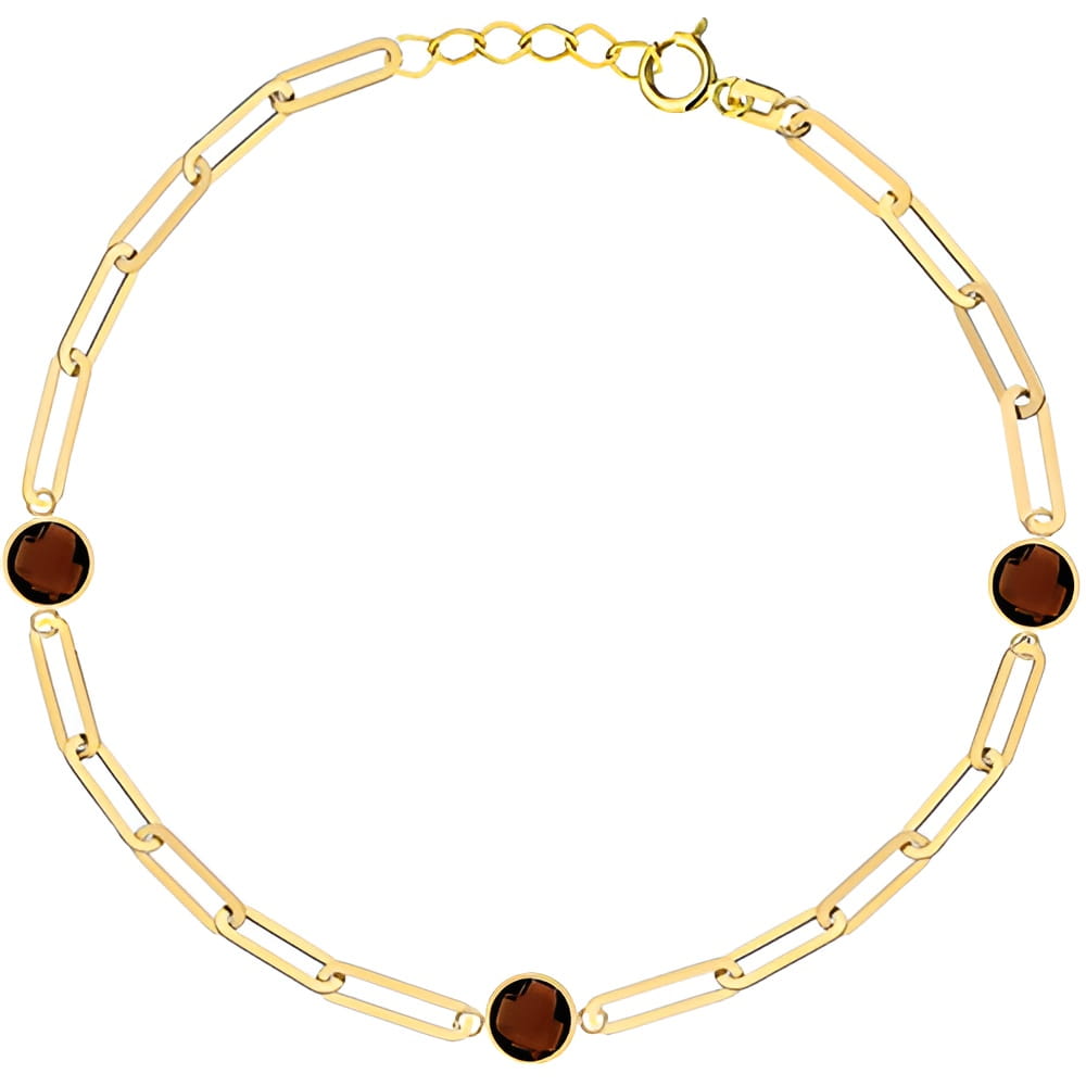 Bransoletka wykonana z złota próby 585 zachwyca eleganckim splotem długich ogniw. Wyróżniają ją trzy elementy ozdobne z brązowego kwarcu, które dodają kompozycji szlachetnego charakteru. Lśniące złoto pięknie komponuje się z głębokim kolorem kamieni, tworząc efektowną biżuterię na każdą okazję. Regulowane zapięcie pozwala idealnie dopasować bransoletkę do nadgarstka. Doskonały wybór dla osób ceniących naturalne kamienie i szlachetne złoto.