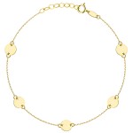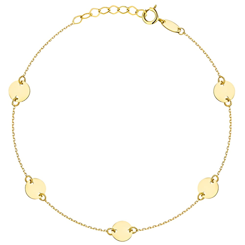 Złota bransoletka pr. 585 z delikatnym łańcuszkiem i gładkimi, pełnymi kółkami to klasyczna ozdoba o eleganckim charakterze. Sześć złotych kółek równomiernie rozmieszczonych na łańcuszku tworzy efektowną i spójną całość. Wykonana z żółtego złota, zachwyca trwałością i ponadczasową estetyką. Regulowane zapięcie pozwala idealnie dopasować długość do nadgarstka. Idealna zarówno na prezent, jak i do codziennego noszenia.