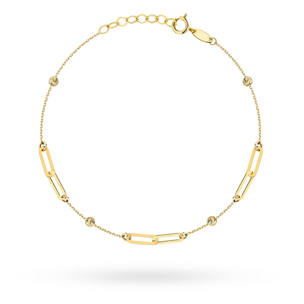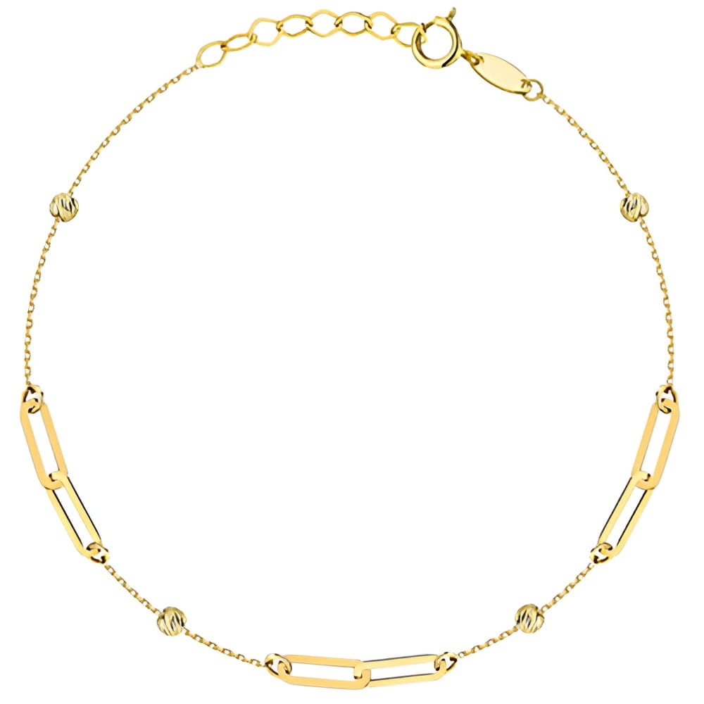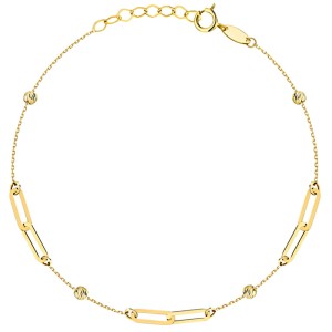 Złota bransoletka pr. 585 złożona z gładkich, prostokątnych ogniw oraz diamentowanych kuleczek to klasyczny model o szlachetnym wykończeniu. W całości wykonana z żółtego złota, przyciąga uwagę delikatnym połyskiem i starannym wykonaniem. Harmonijne rozmieszczenie elementów dodaje jej lekkości i elegancji. Regulowane zapięcie umożliwia idealne dopasowanie do nadgarstka. Doskonały wybór dla kobiet ceniących ponadczasową biżuterię ze złota.