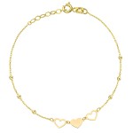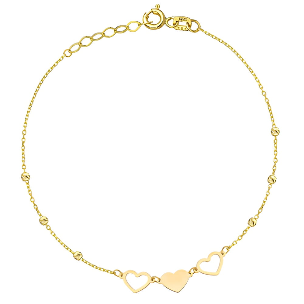 Bransoletka wykonana ze złota próby 585 zachwyca motywem trzech serc – dwóch ażurowych i jednego pełnego. Delikatny łańcuszek z ozdobnymi kuleczkami nadaje jej lekkości i elegancji. To wyjątkowa propozycja dla osób, które chcą wyrazić uczucia i bliskość w formie biżuterii. Dzięki regulowanemu zapięciu bransoletka dopasowuje się do różnych nadgarstków. Doskonała na prezent – symbol miłości, czułości i delikatności.