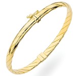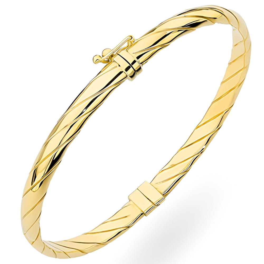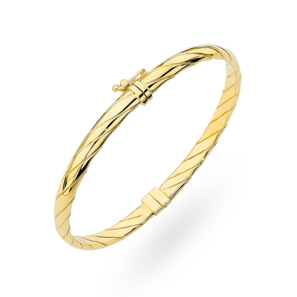 Złota sztywna bransoletka pr. 585 z efektownym skrętnym żłobieniem, które pięknie odbija światło. Wykonana z najwyższej jakości żółtego złota, prezentuje się niezwykle elegancko i klasycznie. Bezpieczne zapięcie na zatrzask zapewnia wygodę i trwałość użytkowania. Idealna jako biżuteria okazjonalna lub dodatek do codziennego stroju, który przyciąga uwagę.