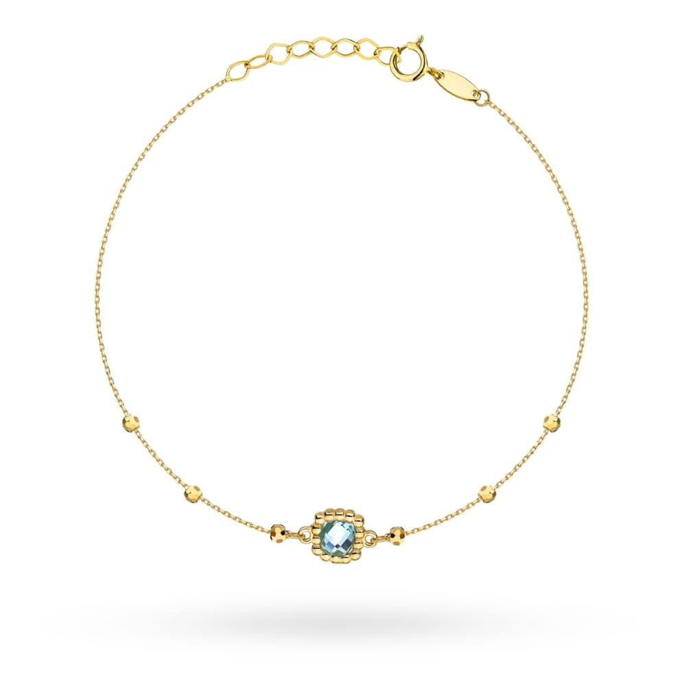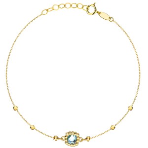 Bransoletka z żółtego złota próby 585 urzeka delikatnym łańcuszkiem ozdobionym diamentowanymi kulkami oraz centralnym elementem z niebieską cyrkonią. Kamień osadzony w dekoracyjnej oprawie pięknie odbija światło, dodając kompozycji elegancji i koloru. Regulowane zapięcie zapewnia wygodne dopasowanie do nadgarstka. To lekka i efektowna biżuteria, idealna na prezent lub do noszenia na co dzień. Model, który łączy złoto z subtelnym błyskiem koloru.