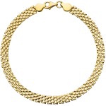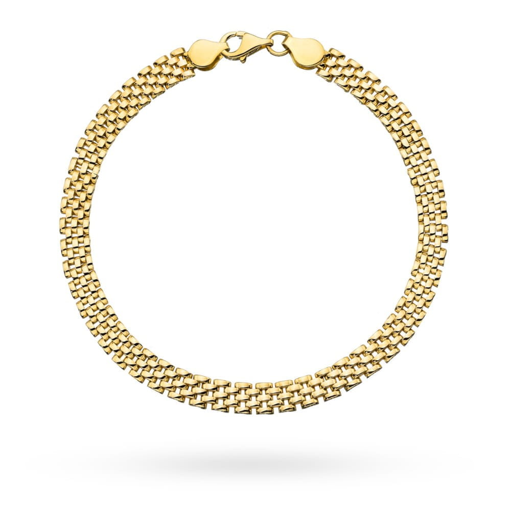Bransoletka z żółtego złota próby 585 wykonana w efektownym splocie typu pancerka podwójna, który tworzy szeroki, gęsty pas biżuterii o lśniącej powierzchni. Precyzyjne ogniwa zapewniają trwałość oraz elegancki wygląd, który pięknie układa się na nadgarstku. Model ten to idealne połączenie klasyki z wyrazistą formą, odpowiedni zarówno na co dzień, jak i na wyjątkowe okazje. Zapięcie typu karabińczyk zapewnia wygodę i bezpieczeństwo. Biżuteria dla kobiet, które lubią mocne, złote akcenty.