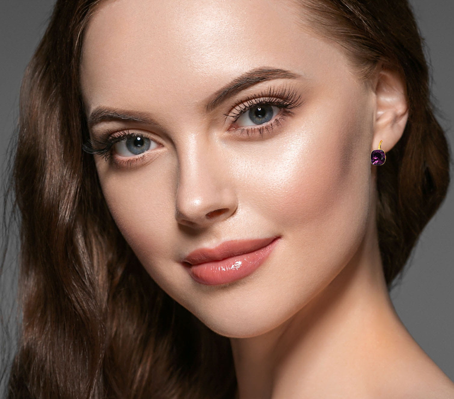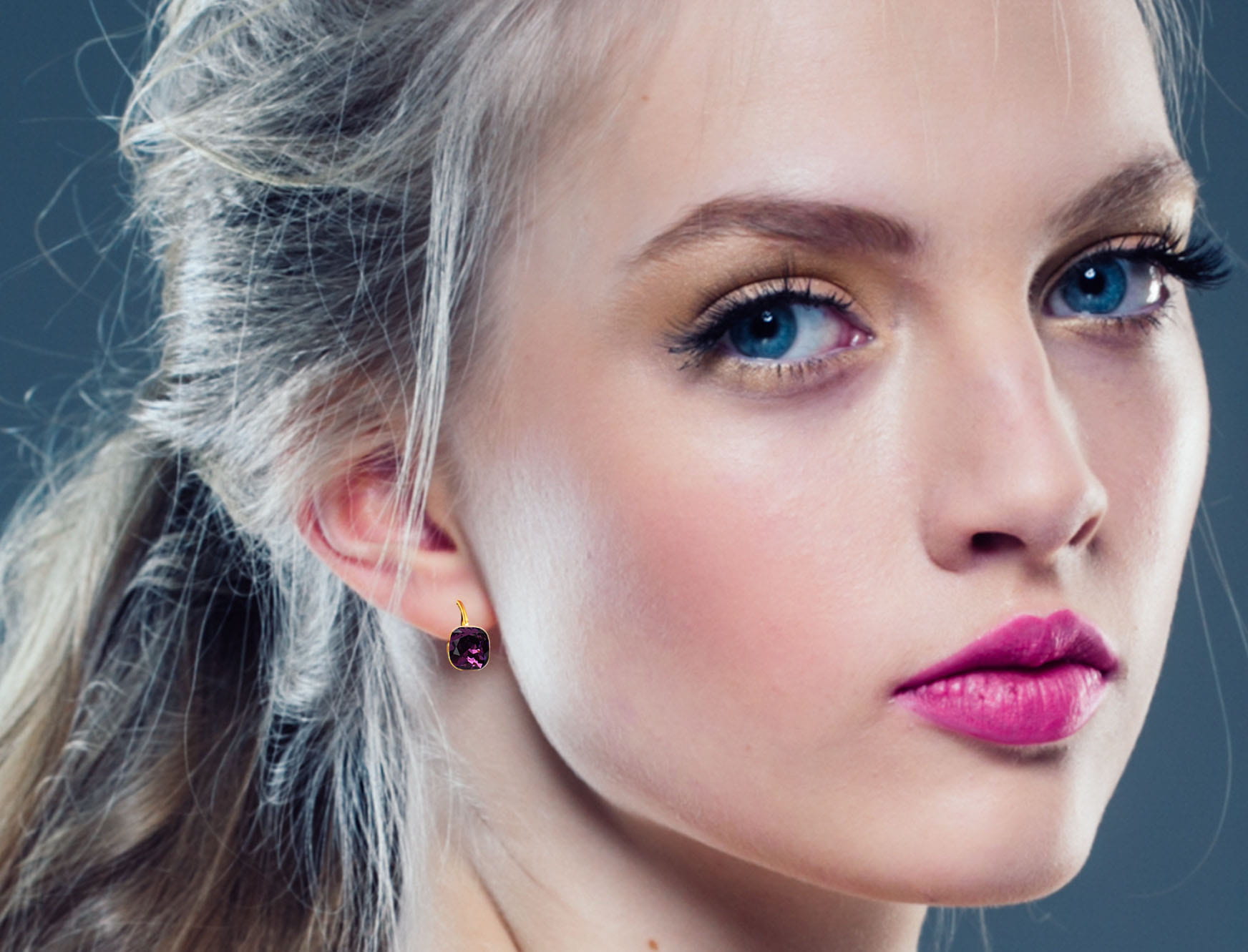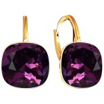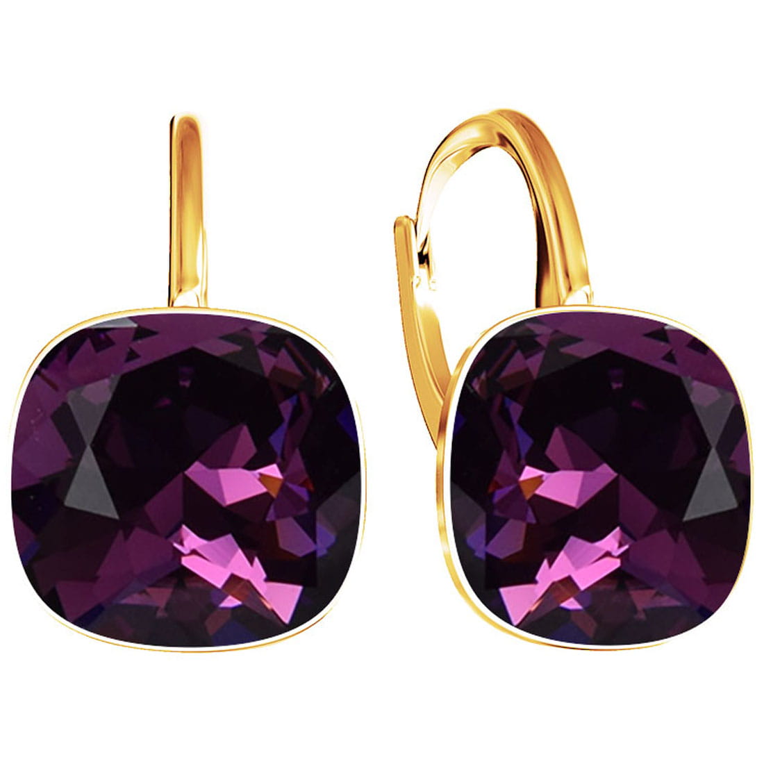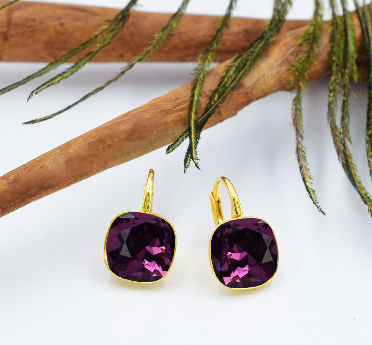 Złote Damskie Kolczyki Square z Markowymi Kryształami Prezent na Dzień Kobiet - Amethyst - Srebro 925
