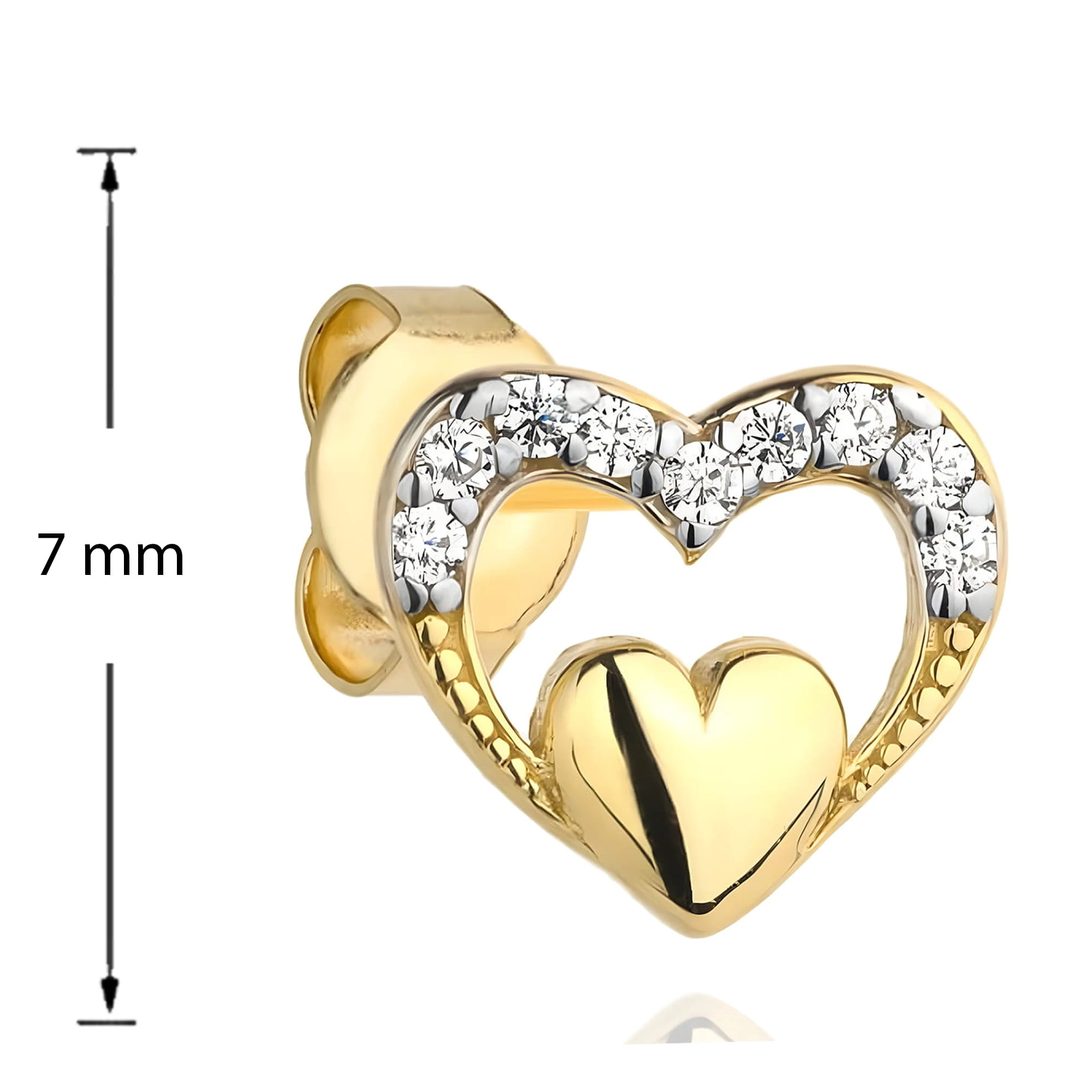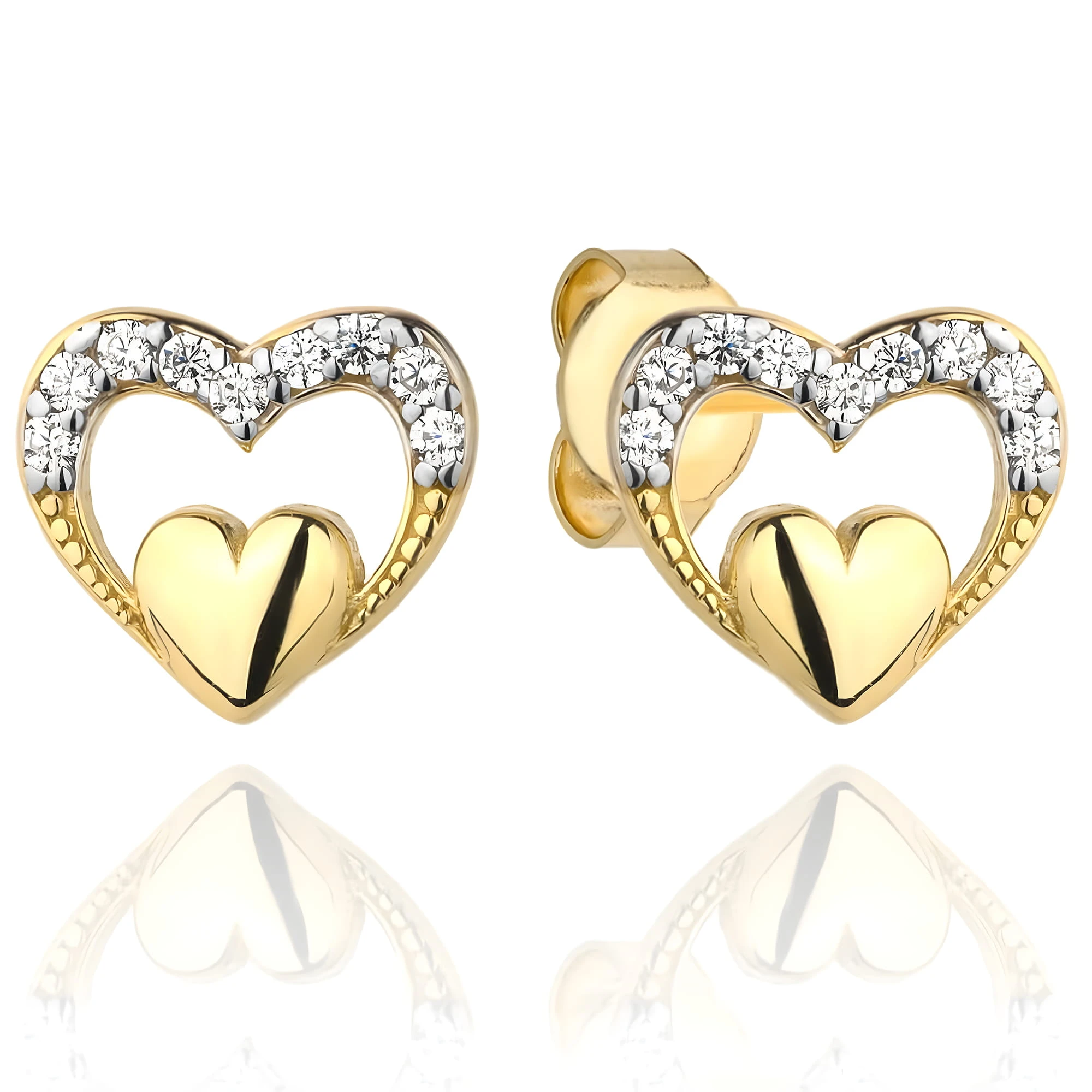 Złote Kolczyki 585 - Serduszko w Sercu Wysadzonym Cyrkoniami - Delikatna Damska Biżuteria