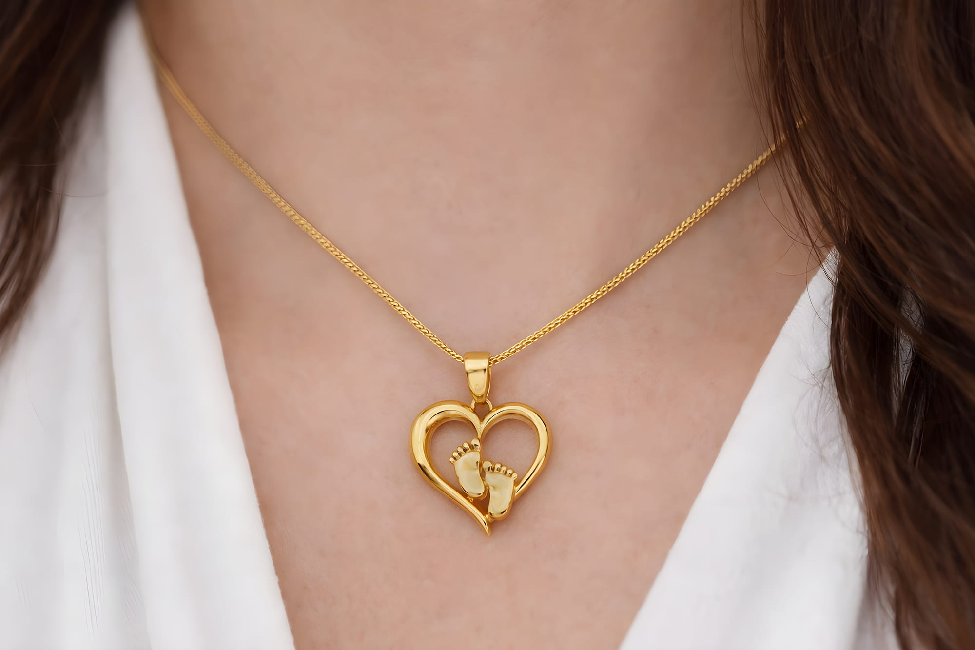 Ten złoty naszyjnik ze złota próby 375 to biżuteria, która opowiada historię od pierwszego spojrzenia. Delikatna zawieszka w kształcie otwartego serca, w którym spoczywają dziecięce stópki, symbolizuje moment narodzin, bezwarunkową miłość i więź, która zaczyna się od pierwszego dotyku. To wzór pełen emocji – subtelny, a jednocześnie niezwykle wymowny.