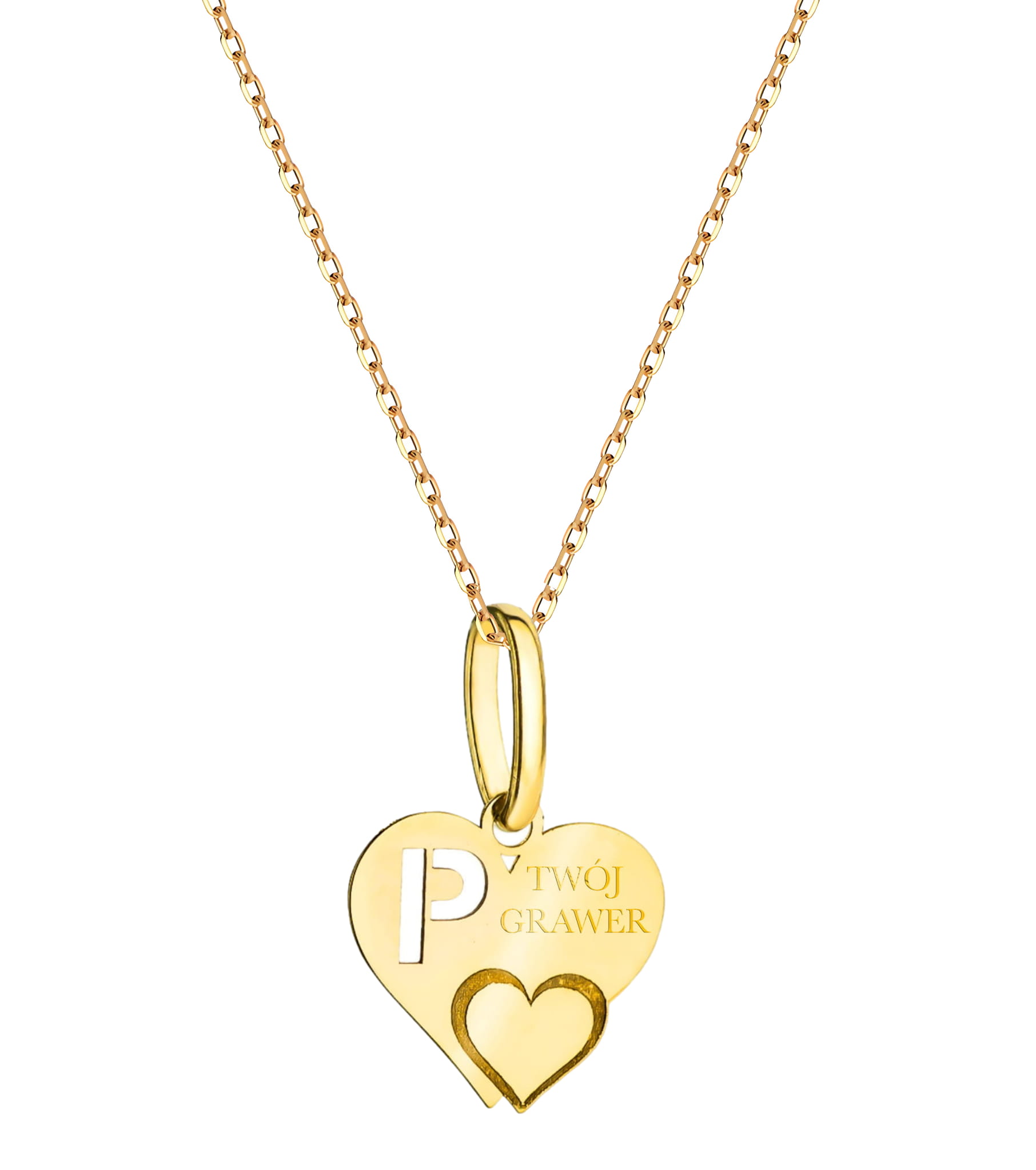 Złota zawieszka w formie serca z inicjałem "P" oraz opcją personalizacji poprzez grawerunek, na delikatnym łańcuszku typu ankier o długości 42+3 cm