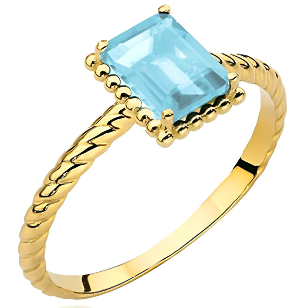 Ekskluzywny pierścionek ze złota próby 585, ozdobiony błękitnym topazem w prostokątnej oprawie. Kamień otaczają drobne złote kuleczki, dodając mu elegancji i wyjątkowego charakteru. Ozdobna, skręcana szyna nadaje pierścionkowi unikalny wygląd, idealnie komponując się z blaskiem kamienia.